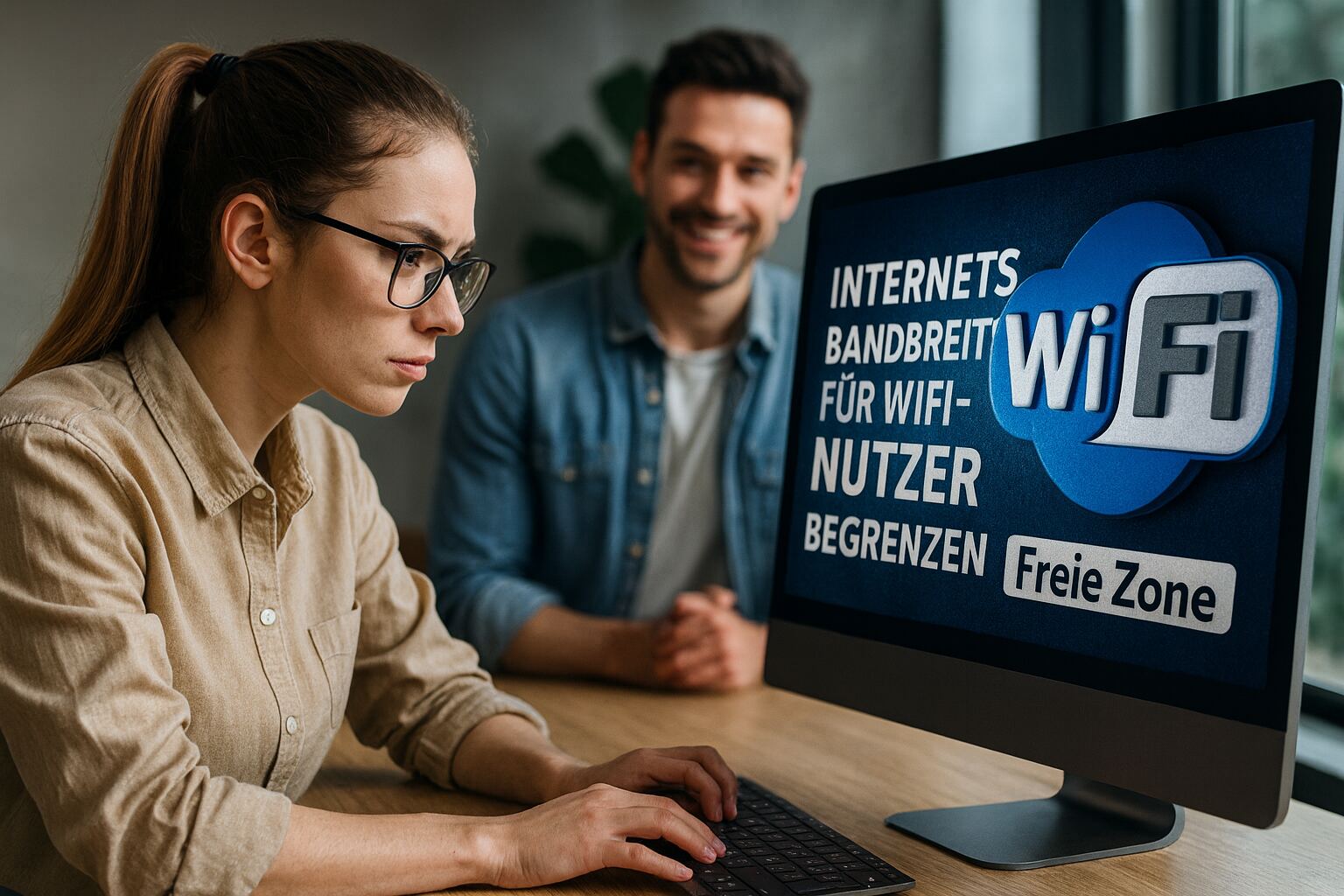 التحكم في النطاق الترددي - امرأة تقوم بتكوين التحكم في نطاق ترددي WiFi على جهاز الكمبيوتر الخاص بها للحد من عدد المستخدمين وزيادة سرعة الإنترنت على الشبكة.