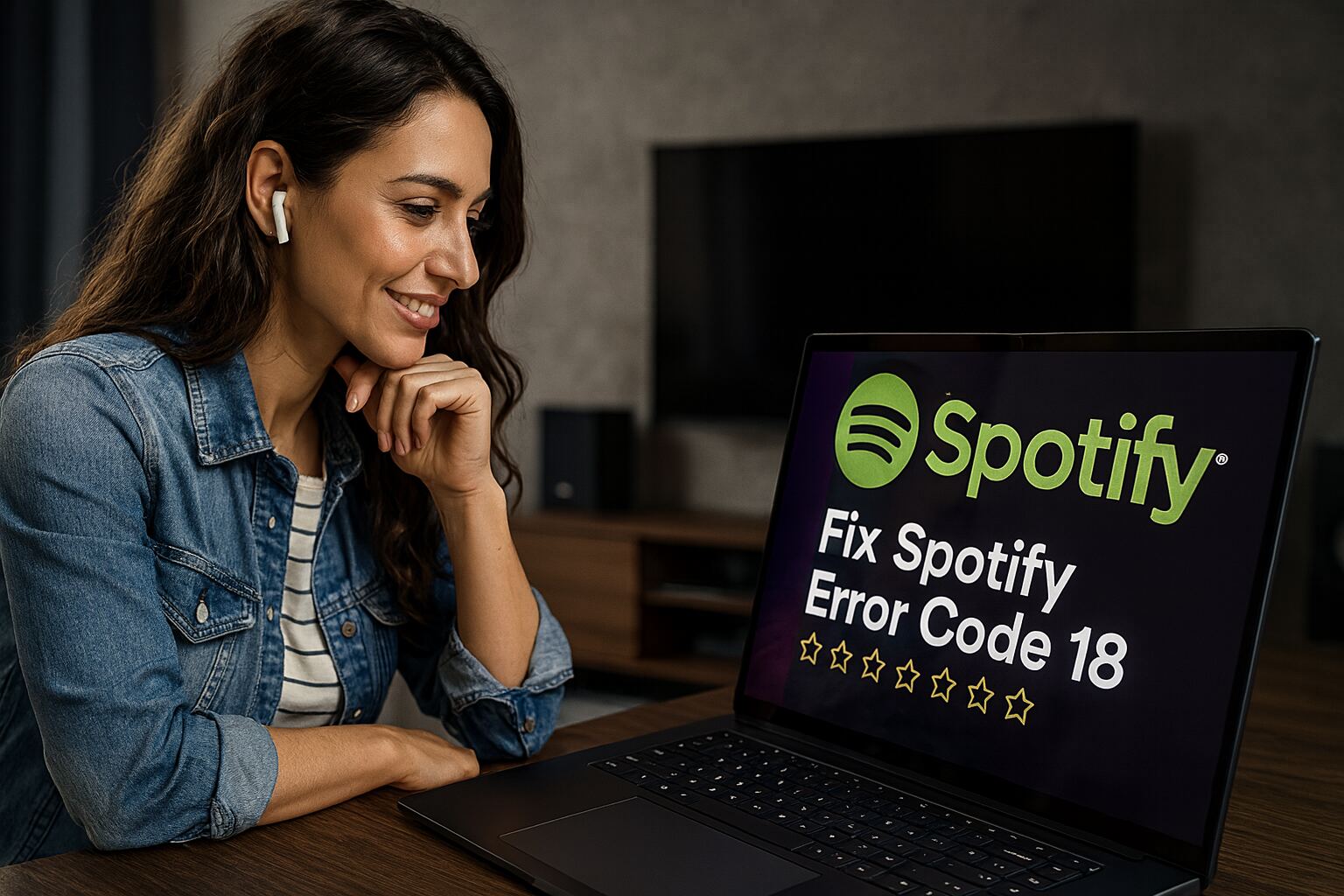 Spotify 오류 18 - 헤드폰을 착용한 여성이 노트북을 보고 있으며, Spotify 화면에는 "Spotify 오류 코드 18 수정"이라는 메시지가 표시되어 있습니다. 이는 Windows에서 Spotify 오류 18을 빠르게 수정하는 방법을 보여줍니다.