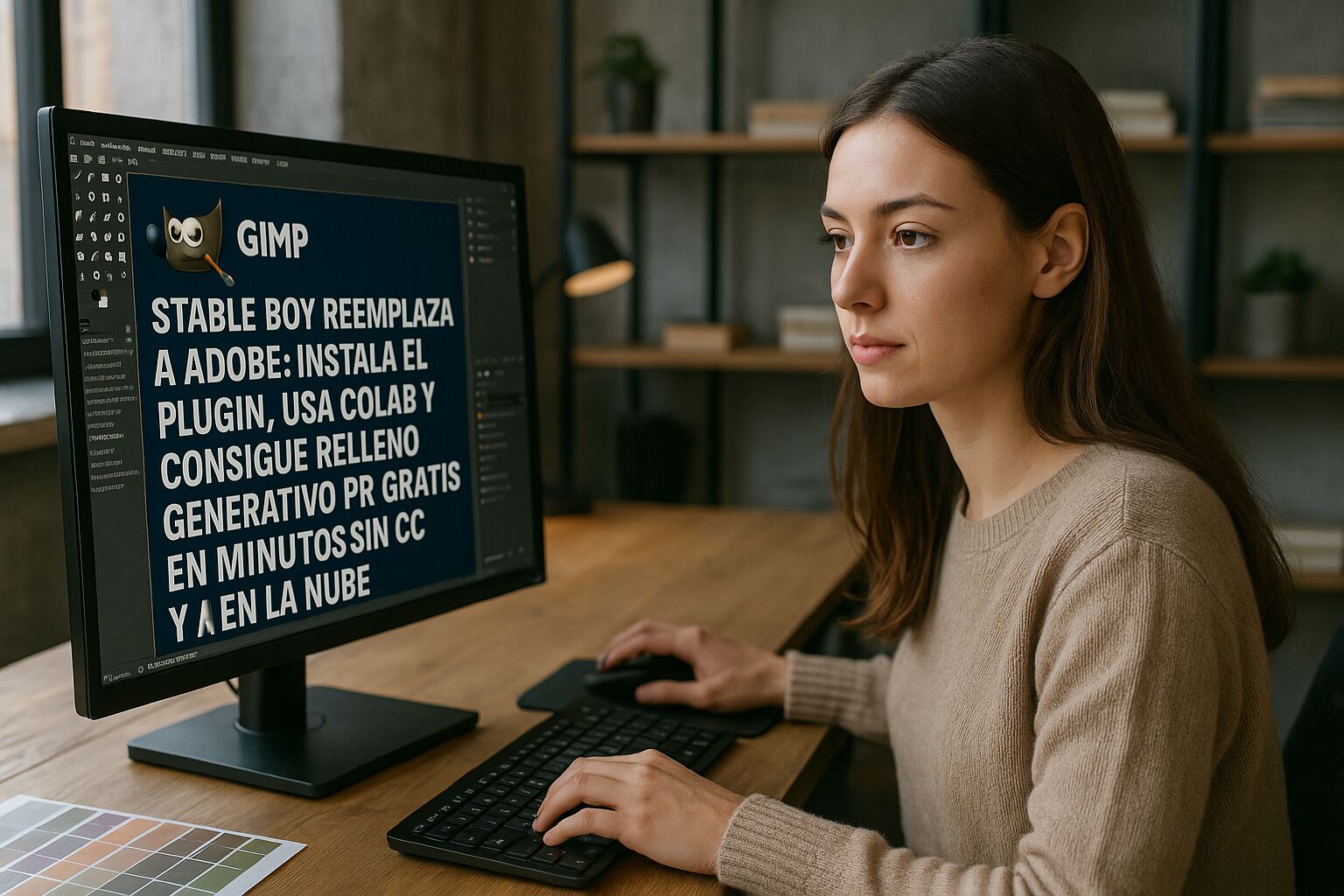 GIMP Stable Boy - ผู้ใช้ที่โต๊ะทำงานใน GIMP หน้าจอแสดงบทช่วยสอนปลั๊กอิน GIMP Stable Boy เป็นภาษาสเปนสำหรับ generative fill ฟรี ซึ่งเป็นทางเลือกโอเพ่นซอร์สของ Adobe