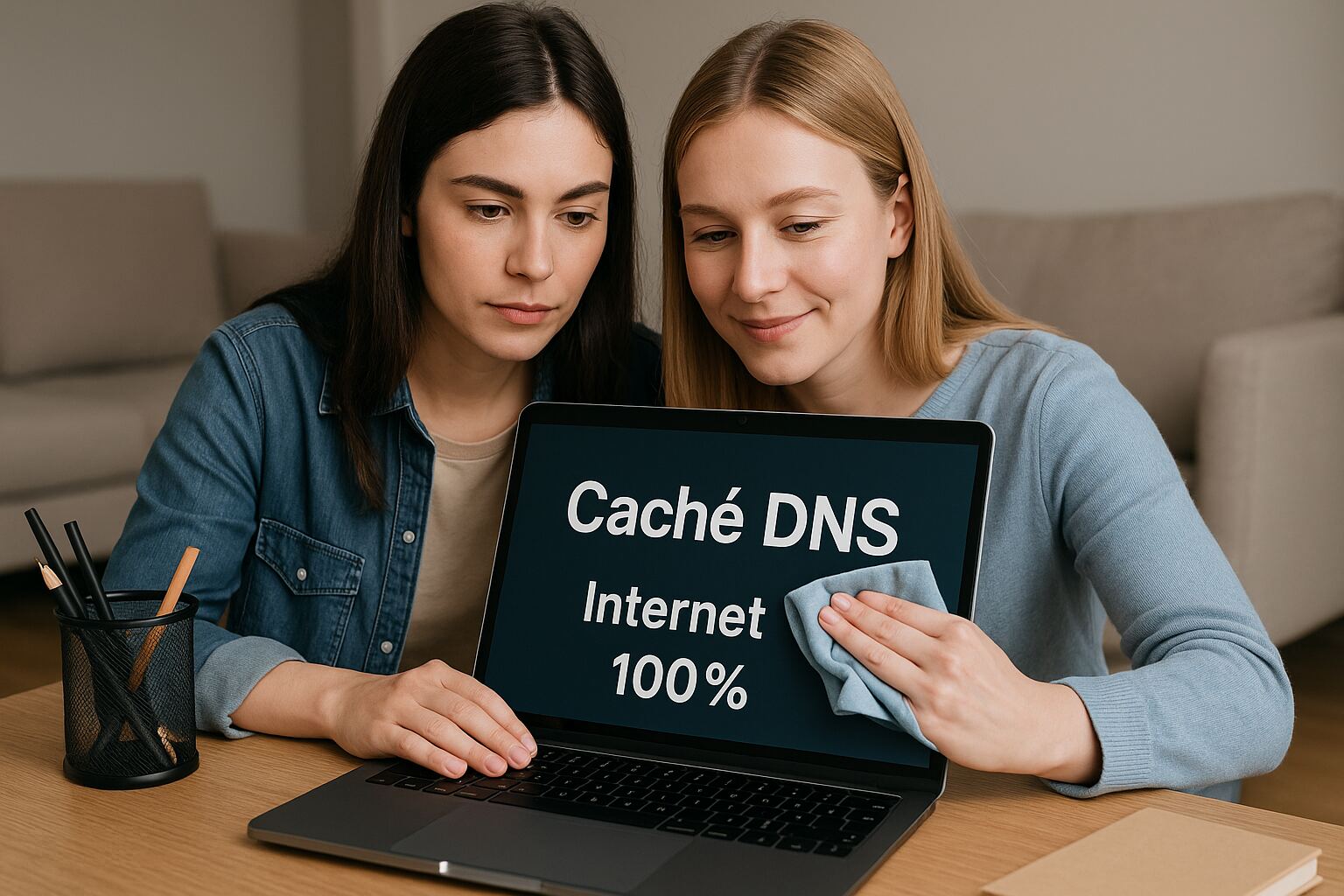 DNS 缓存 - 两名女子正在清洁笔记本电脑屏幕,屏幕上显示“DNS 缓存 Internet 100%”字样,演示如何清除 DNS 缓存以改善您的互联网连接。